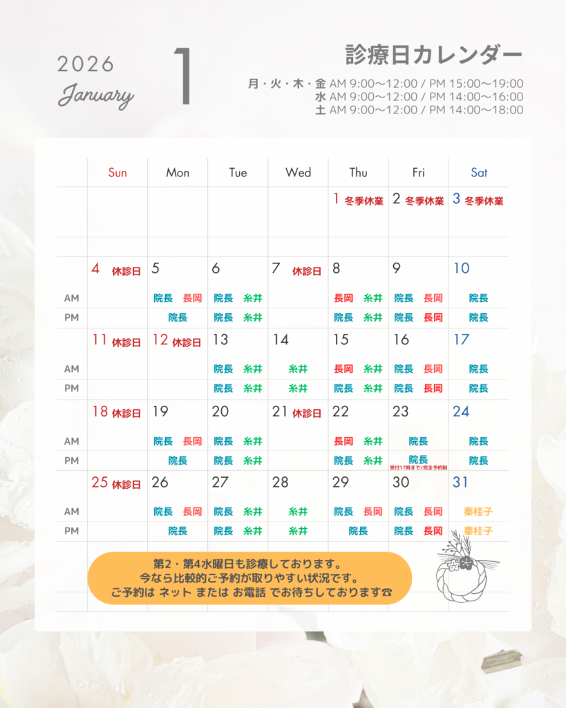 9:00~19:00(水・日・祝休診、土曜日は18時まで)